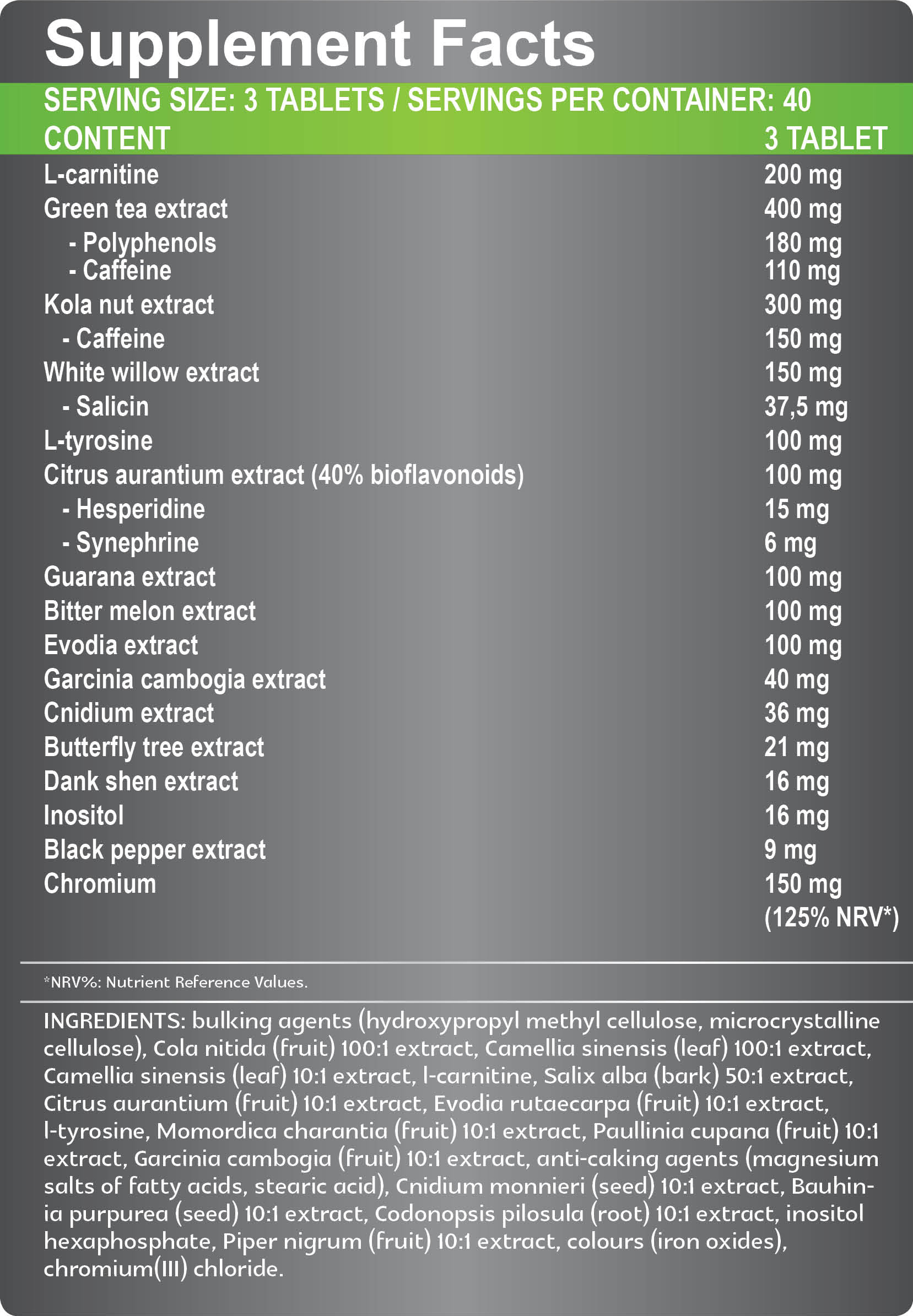 Proporciona cafeína de 3 fuentes (cafeína pura directamente, a partir de extracto de té verde y de extracto de nuez de cola) y sinefrina de Citrus aurantium.
